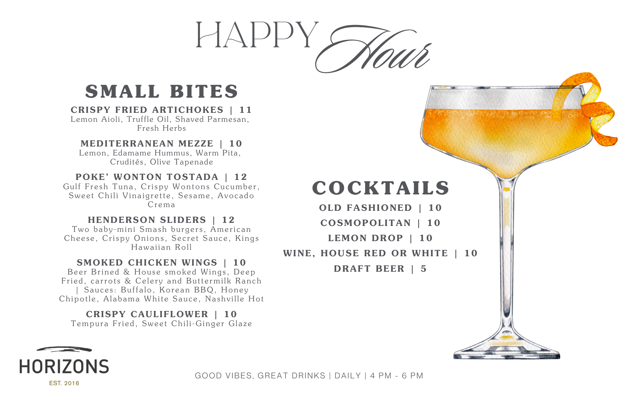 | Happy Hour | 4:00 p.m.-6:00 p.m. |