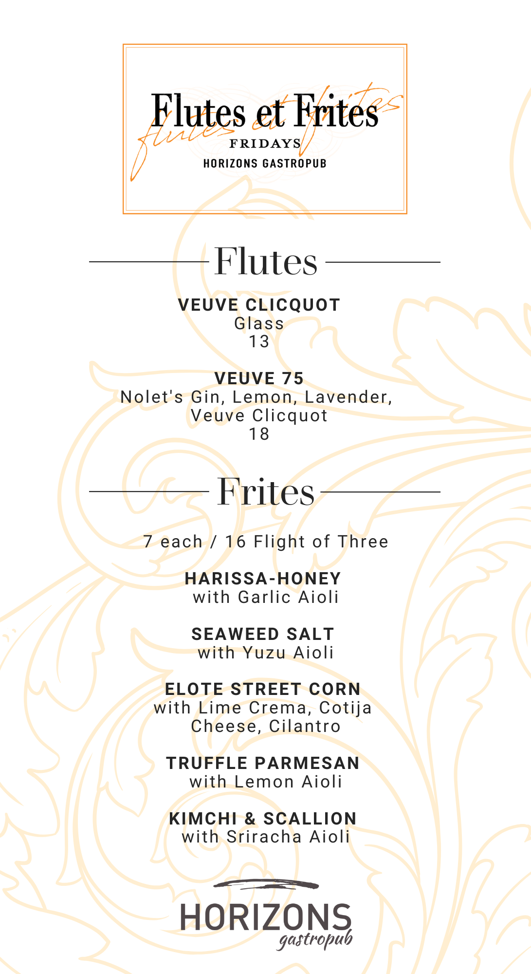 Flutes et Frites brings a chic champagne bar experience to Horizons, pairing Veuve Clicquot with five styles of gourmet fries for the ultimate sip-and-snack indulgence. Join us at Horizons at Henderson Beach Resort to toast the evening in style with bubbles, bold flavors, and panoramic Gulf views. Check out our menu.